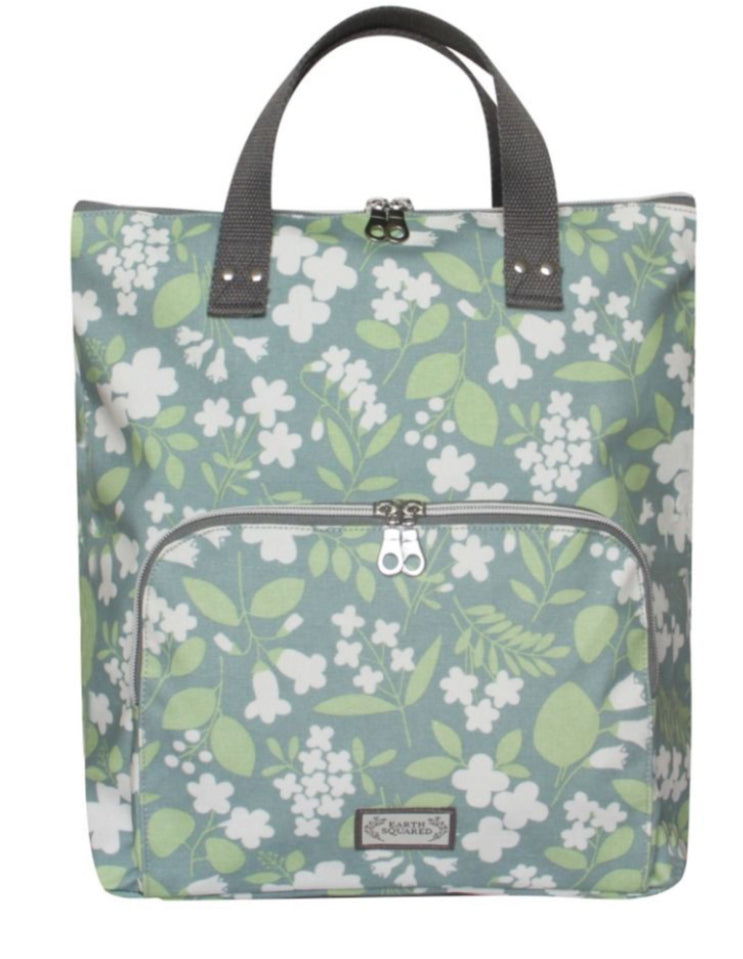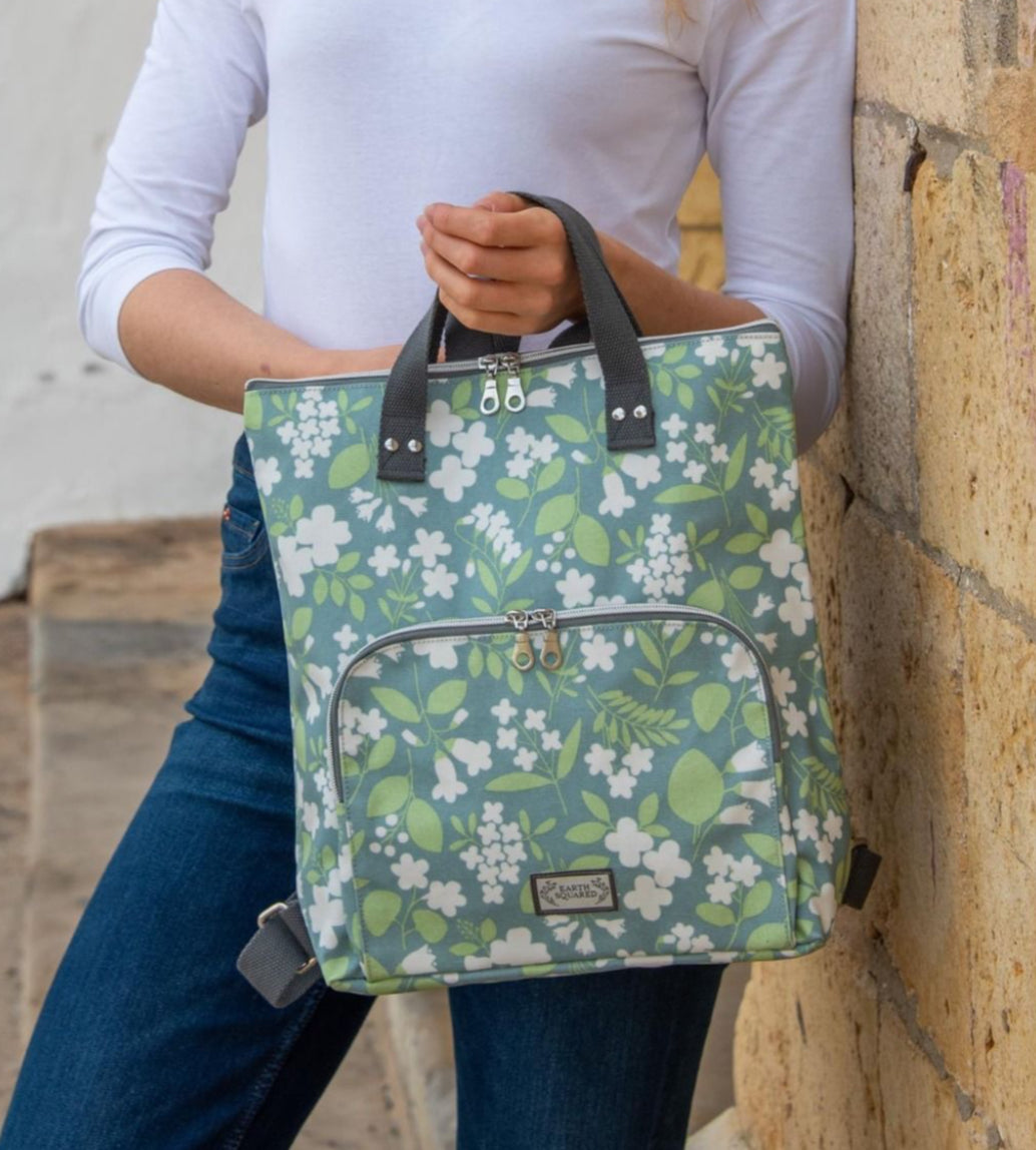 New backpack style with double ended zips, front stash pocket, top grab handles and lined with a fully recycled water resistant lining. This pretty denim floral design, in durable Oilcloth, is ideal for our unpredictable weather!