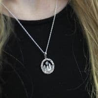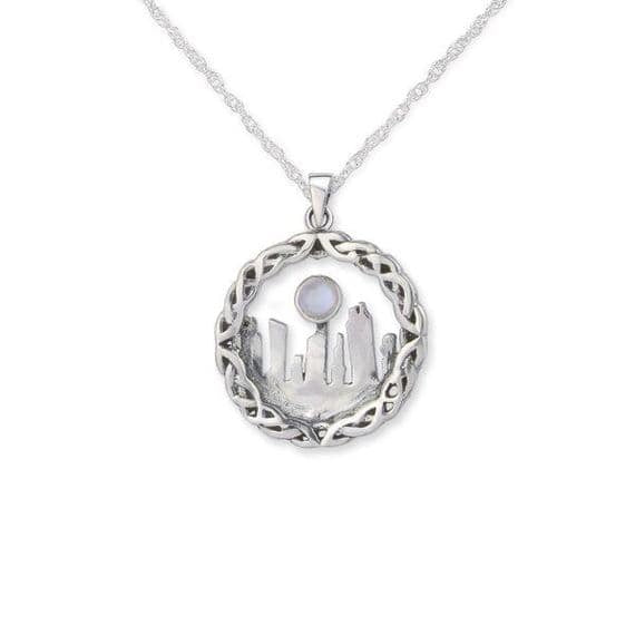 Crafted entirely of 925 Sterling Silver, the design of the Pendant features ancient Scottish Standing Stones with a moon rising above them. The moon is represented by a genuine Moonstone gemstone, and the entire design is encircled with traditional Highland knotwork.
