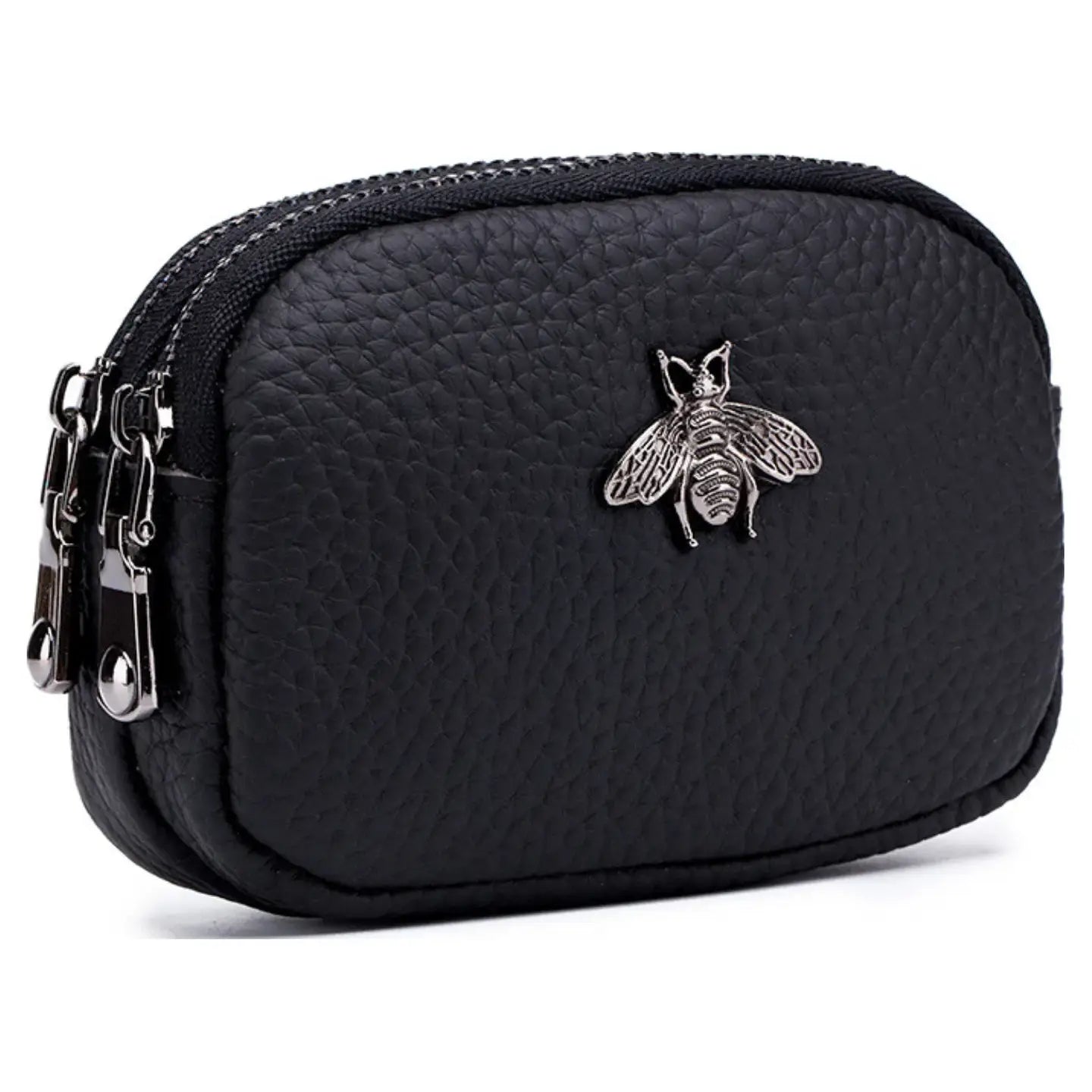 Real Leather Double Zipper Bee Coin Purse Card Holder Note Purse