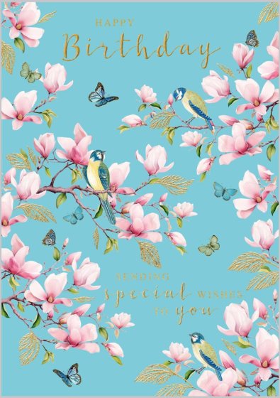 "Magnolia Blossom and Bluetits", a birthday card from the Belgravia range. Printed on art board and finished with foil and embossed details.