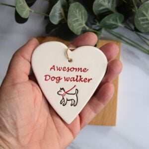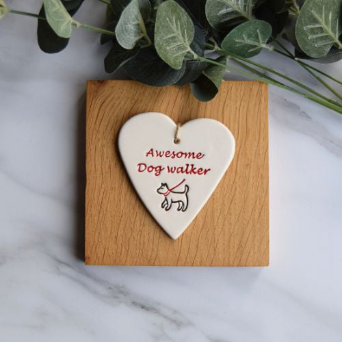 Awesome Dog Walker is a handmade ceramic heart which measures approximately 8.5cm x 7.5cm and is a perfect gift for your doggy walker.
