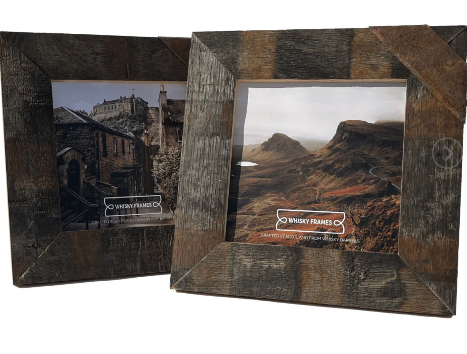 Our Stave Frames are hand made from beautiful American Oak retired chunky Scottish Whisky barrel staves. We reuse the metal band from the barrel hoops for a finishing touch on the corner of the frame. Every frame is one of a kind!