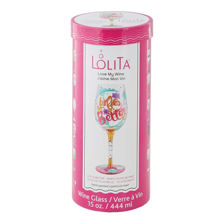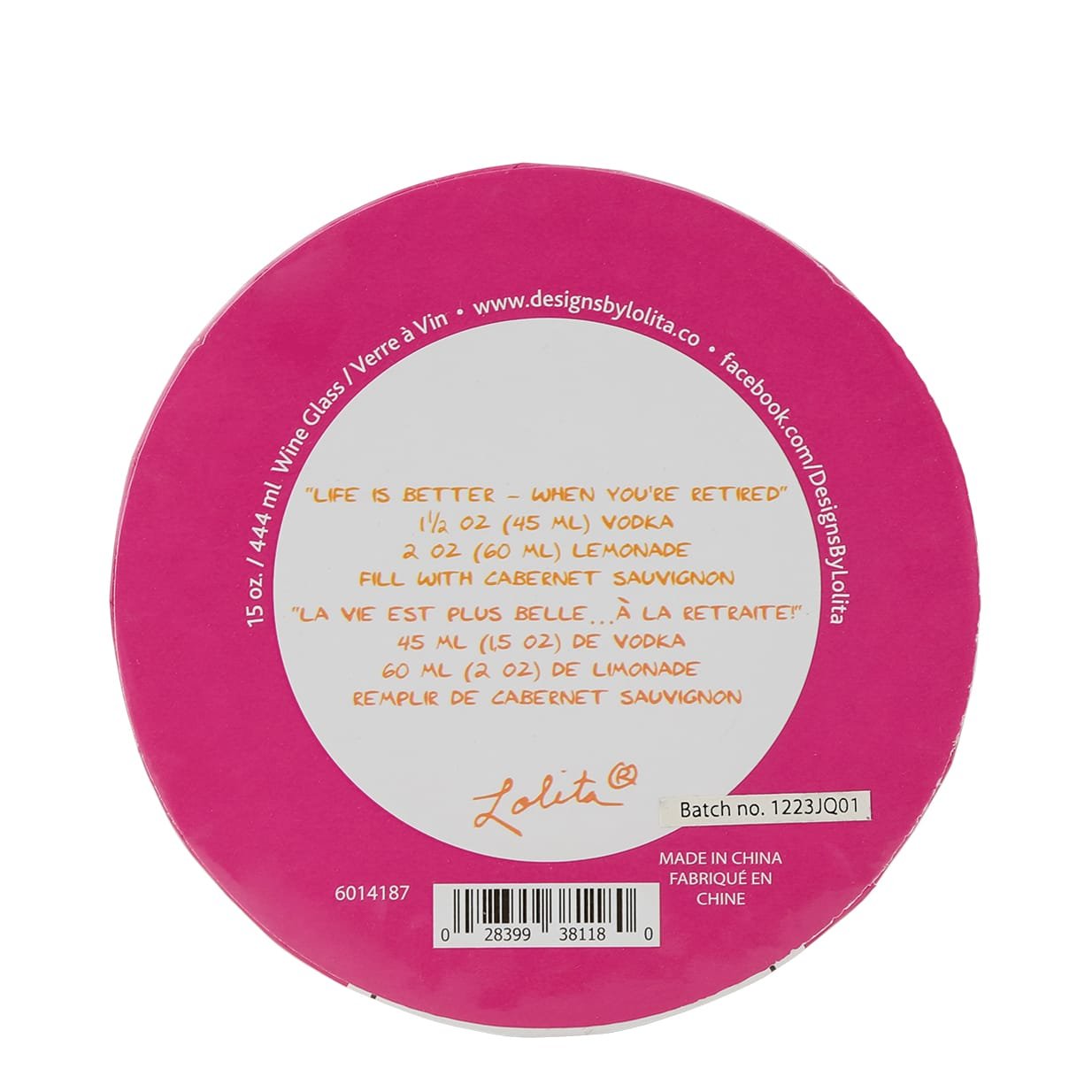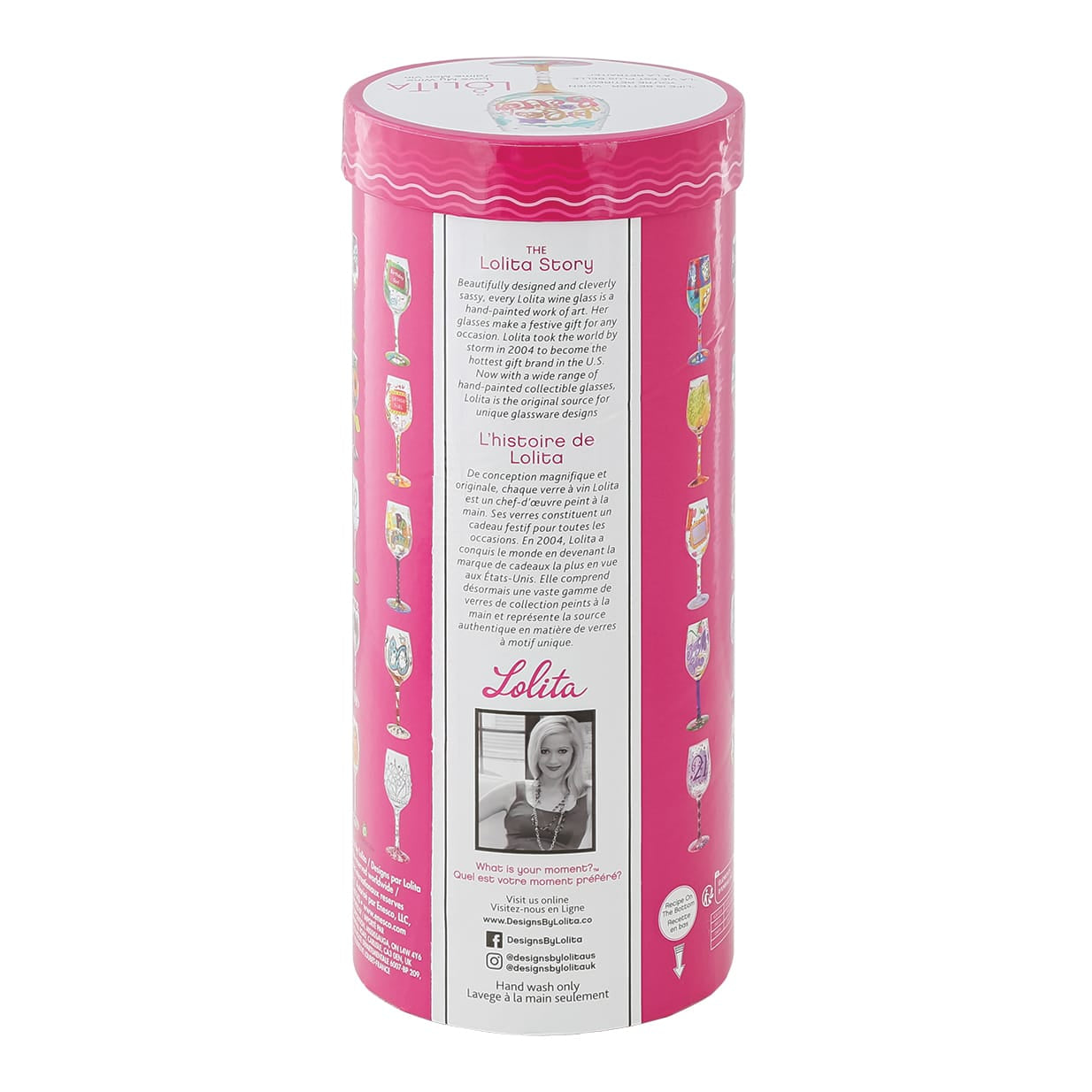 With balloons and and bedazzled crystal details, this brightly coloured wine glass celebrates the joy of retirement. With a delightful hand-painted design and dazzling gems, this cheerful cup toasts to the promise of new adventures and guilt-free relaxation. Each glass features a cocktail recipe on the base and comes in a branded gift box. Celebrate the next chapter of life with Lolita, cheers to you| 15oz capacity. Hand wash only.