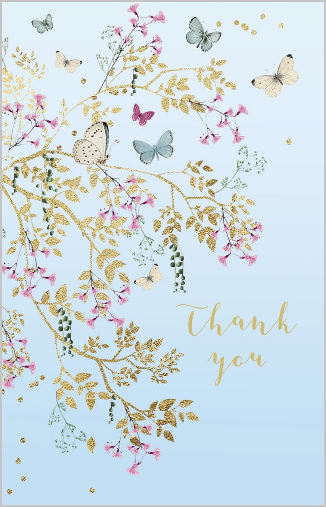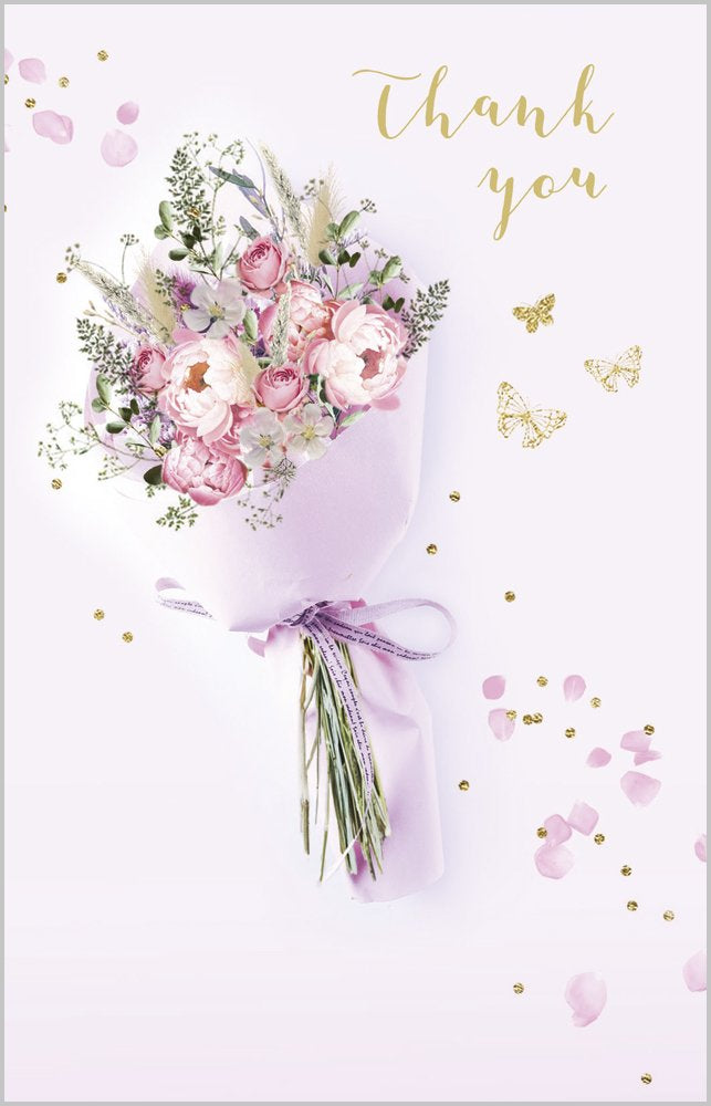 "Thank You Bouquet & Butterflies", a cardboard wallet-style hanging pack of eight note cards (90 x 140mm) and envelopes, containing four cards each of two designs. Printed on smooth board with a matt varnish finish.
