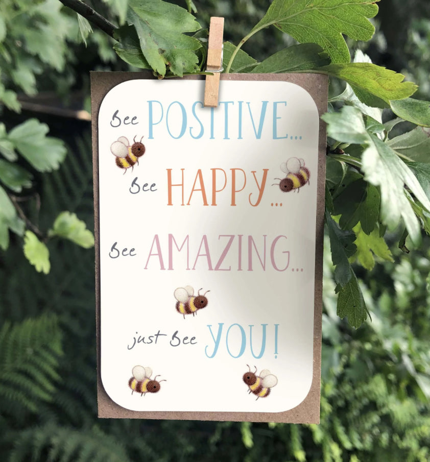 Bee Positive” caption. Features illustrated cute bumble bees buzzing around the caption.