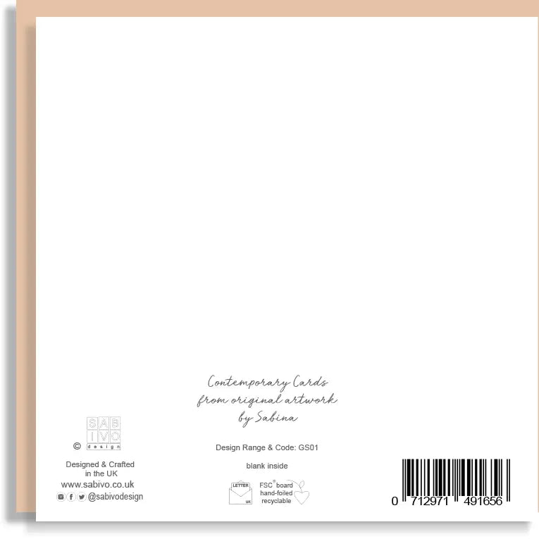 Hand illustrated design from original floral artwork. The cards are blank inside. Greeting card size is 145 X 145 mm, packed with envelope size is 155 X 155 mm. Designed, crafted and printed in the UK on UK sourced, FSC certified board. Each greeting card is packed with UK sourced, brown kraft 100% recycled envelope and a UK sourced cello bag.