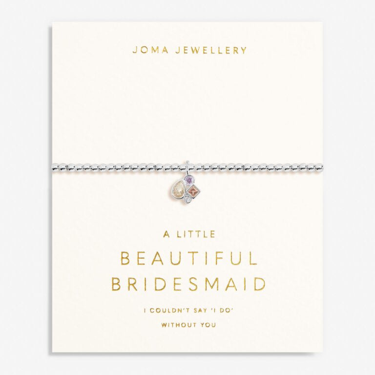 Framed with a luxe linen card and stamped with a golden sentiment, our Bridal A Little 'Beautiful Bridesmaid' Bracelet In Silver Plating features a classic stretch design and a dazzling gemstone cluster pendant which is guaranteed to turn heads.