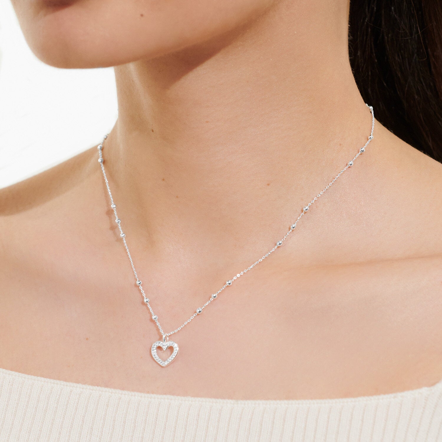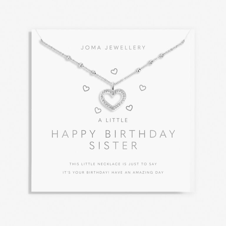 The A Little 'Happy Birthday Sister' Necklace In Silver Plating features a silver-plated beaded chain, a shining pavé heart pendant, and an adjustable lobster clasp fastening.
