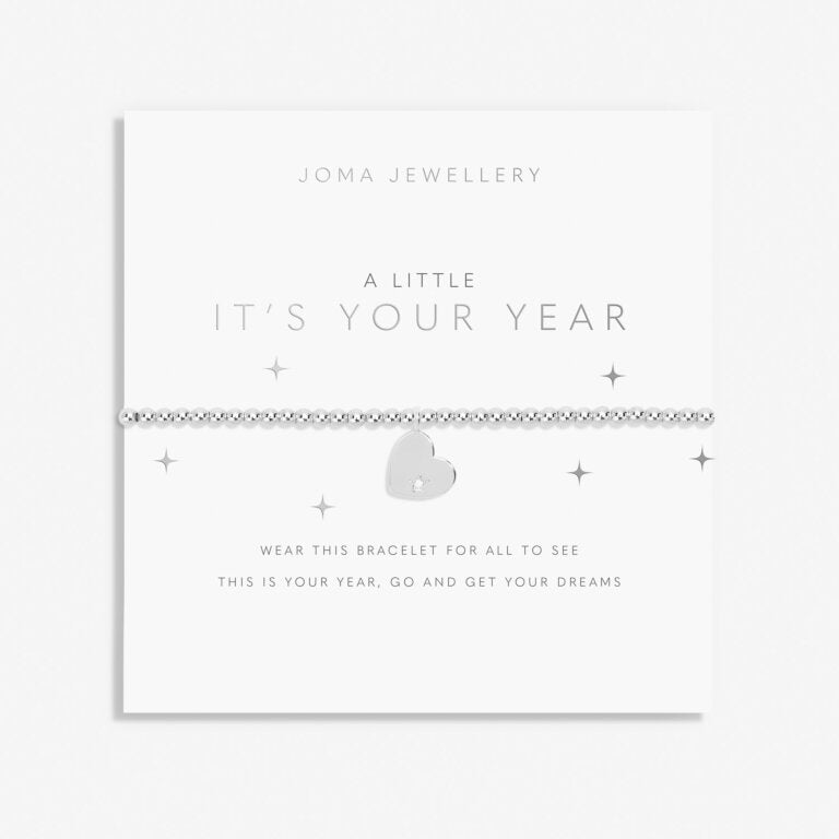 Our A Little 'It's Your Year' Bracelet In Silver Plating features a captivating stretch design and a precious silver-plated heart charm. Wrapped around one of our stylised cards and framed with the sweet sentiment.