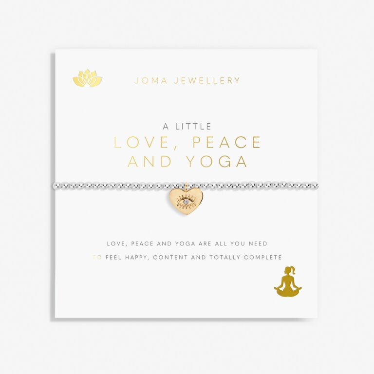 The A Little 'Love, Peace And Yoga' Bracelet makes the perfect 'just because' gift. Featuring a silver-plated design and is decorated with a golden heart-shaped charm. Perfectly presented, the bracelet is wrapped around one of our signature cards and framed by a sweet sentiment.