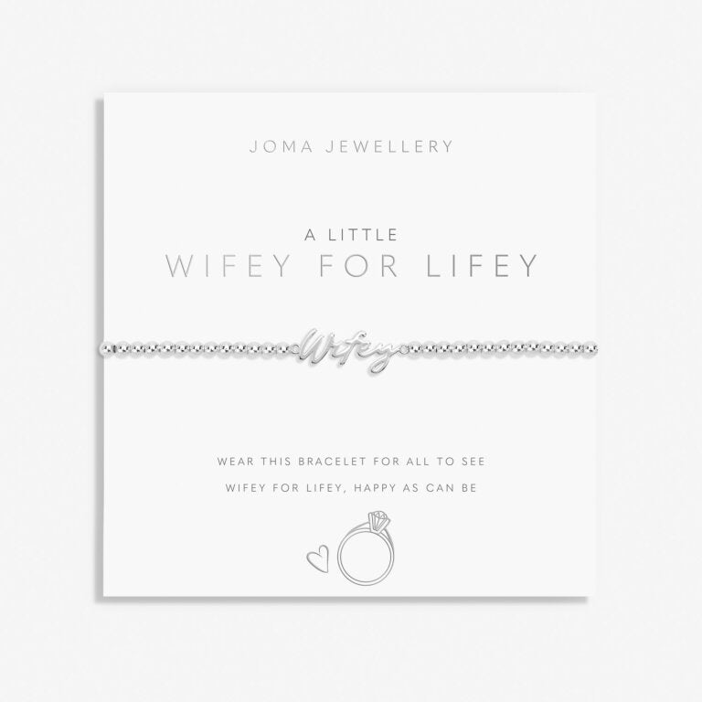Our A Little 'Wifey For Lifey' Bracelet In Silver Plating features a captivating stretch design and a precious silver-plated charm in cursive script font. Wrapped around one of our stylised cards and framed with the sweet sentiment.