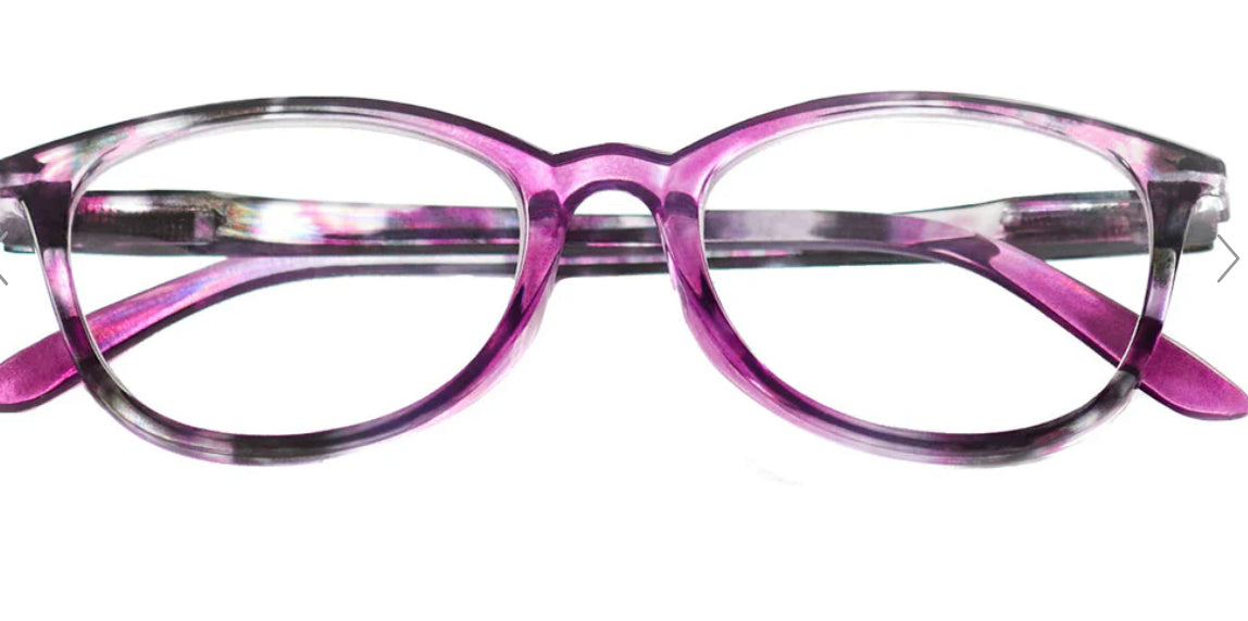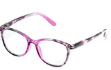 Bestselling round design in eyecatching purple/pink shades with coordinating pattern arms. Quality reading lenses with sprung hinges for extra durability.