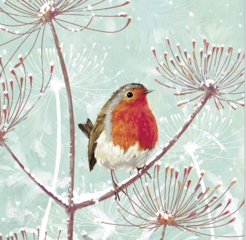 "Winter Robin", a cello pack of eight Charity Christmas cards (137 x 137mm) and envelopes. Supporting Marie Curie Cancer Care and British Heart Foundation. Printed on smooth board and finished with a matt varnish.