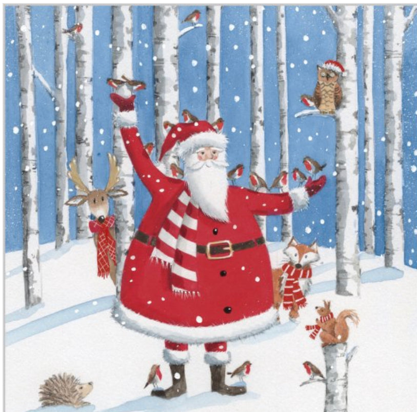 "Woodland Father Christmas", a cello pack of eight Charity Christmas cards (137 x 137mm) and envelopes. Supporting Marie Curie Cancer Care and British Heart Foundation. Printed on smooth board and finished with a matt varnish.