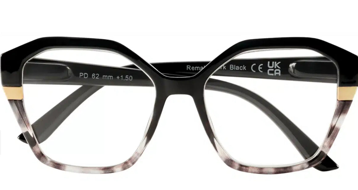 On trend geometric frame in contrasting gloss black with black dapple and pale gold detail. Paired with solid black arms. Quality reading Lenses. Sprung hinges for extra comfort and durability.